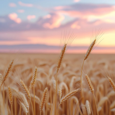 Experience the serene beauty of golden wheat stalks swaying in a tranquil field under a warm sunset. This image captures the essence of nature and abundance.