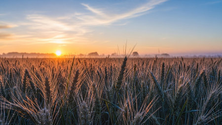 A sunrise paints the sky with warm golden and orange hues, casting a radiant glow over a vast field of ripening wheat. Dew drops glisten on the individual wheat stalks, catching the early morning light and adding a delicate sparkle to the scene. The soft, diffused sunlight creates a serene and tranquil atmosphere, highlighting the textures and colors of the natural landscape. The expansive view of the field stretching towards the horizon evokes a sense of peace and the beauty of agricultural...