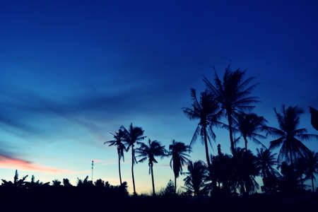 Silhouette of coconut trees with beautiful blue sky at sunset, Photos back - light at the horizon began to turn orange with purple and pink cloud