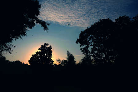Silhouette of Trees and Sky at Sunset or Sunrise Background, HDR