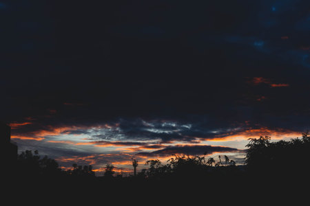 Beautiful sunset sky in dark shades. The sunset breaks through the black clouds..