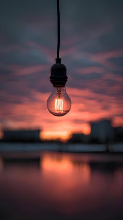 A single incandescent lightbulb glows brightly against a twilight sky, symbolizing the spark of innovation and creativity, perfect for presentations on new concepts and forward-thinking.