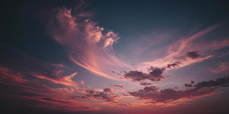 A breathtaking view of a sunset sky filled with soft clouds and vibrant colors, capturing the tranquil beauty of nature during twilight hours.