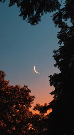 A crescent moon is centered in a vibrant evening sky, transitioning from orange to blue. Dark silhouettes of tree branches and foliage frame the sky. This image features a natural, peaceful composition with soft lighting, suitable for various commercial and editorial purposes.