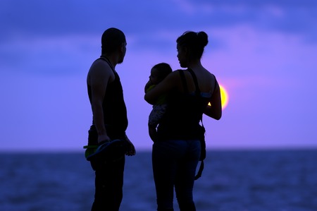 Silhouettes of people on the beach at sunset. City residents are enjoying a weekend by the sea. Dramatic sky and clouds.