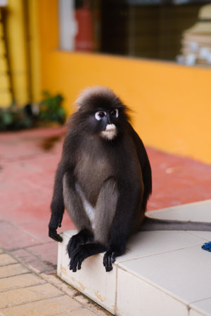 Adorable dusky leaf monkey sitting in a roof gutter