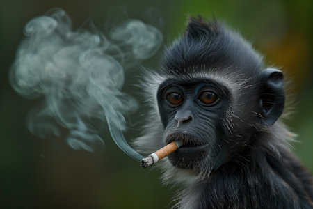 Monkey with a cigarette in his hand, sitting next to a cup of te