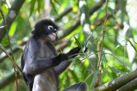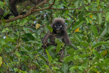 Dusky leaf monkey(Trachypithec us obscurus) sitting on a tree While eating a refreshing morning atmosphere