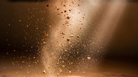 Dust cloud exploding with particles in sunlight, showing motion and texture. Clear details and vibrant colors ...