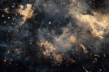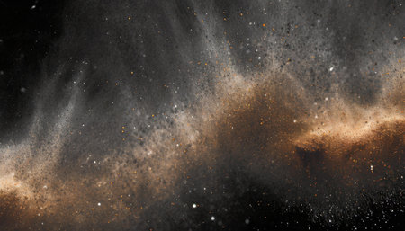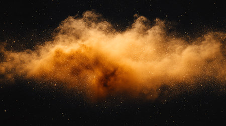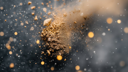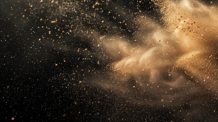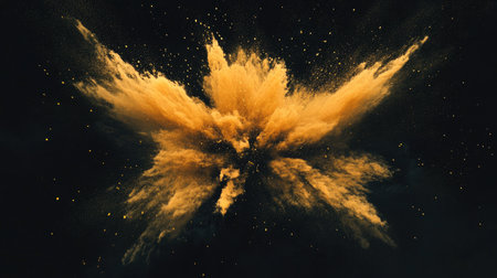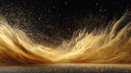 A stunning dynamic capture of a golden powder explosion on a dark background, emphasizing dramatic movement and texture.