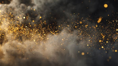 This stunning abstract image illustrates glittering dust particles illuminated by golden light, creating a mesmerizing atmosphere perfect for art and design projects.