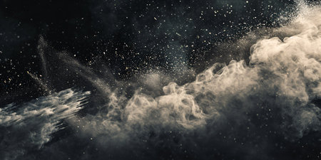 A vibrant cloud of dust erupts with motion and energy, showcasing fine particles in dynamic formation. The image captures the chaotic beauty of nature in a stunning display.