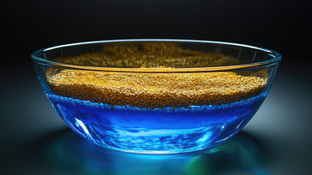 This stunning image showcases a glass bowl filled with vibrant layers of blue liquid and golden particles, merging to create an eye-catching display.
