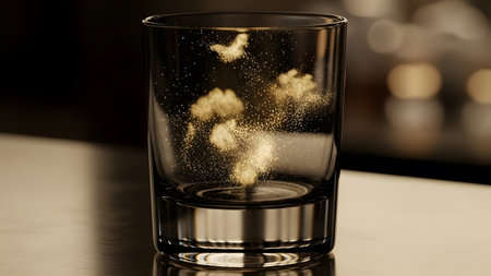 Glass of whiskey with golden splashes on a bar counter in a pub