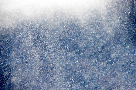 Many snowflakes in blur on black background. Snowfall layer for winter photo.