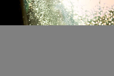 Water drops on the car window. The sunset sunlight shines on the glass. Sun glare. Abstract drip background in green-yellow color.