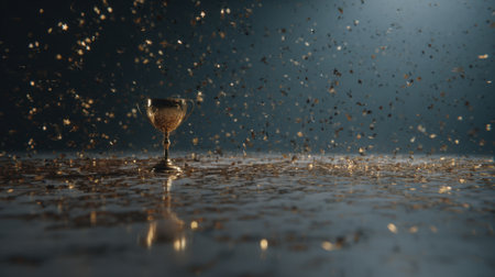 A close-up shot of a wine glass with a golden drink, surrounded by falling water droplets, creating a dramatic and atmospheric scene.