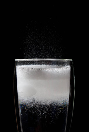 Closeup hands put ice cube into mineral water glass. Ice block spinning in cold cocktail in super slow motion. Macro view from above black background. Preparing drinks and beverages concept