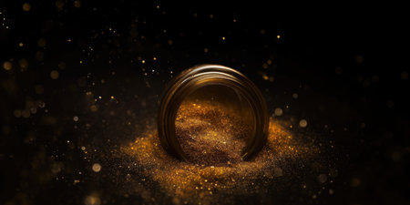 Dust powder of golden glitter on dark background. Generative AI AIG21.