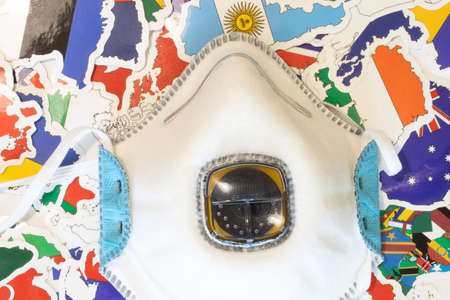 Respirator mask top view. Flat lay with many different country national flags. Concept of world problem with healthcare.