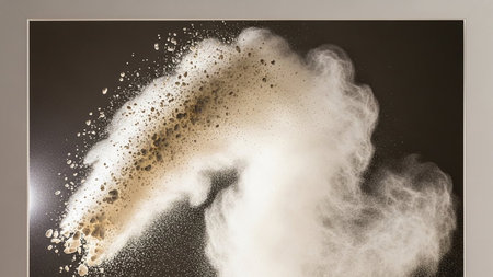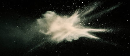 A dramatic capture of white powder exploding mid-air against a dark background, creating a bold visual impact.