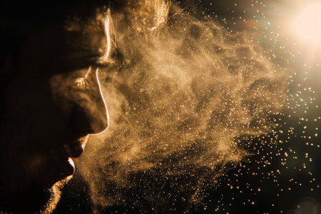 Dust flies in air backlit by light, allergy to dust, tired athlete portrait, man surrounded by dust and splashes, man sneezes because he is allergic, generative ai illustration