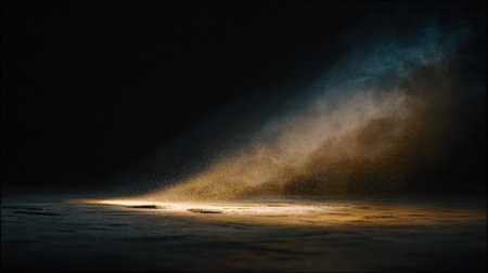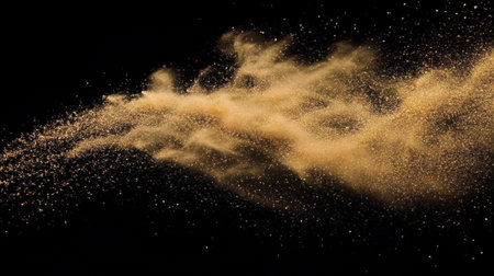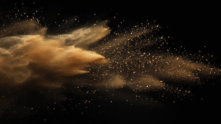 A burst of golden powder fills the air, creating an elegant cloud that dances with light. The scene is dramatic, showcasing movement in a dark space, captivating with its beauty.
