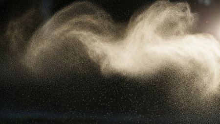 A cloud of light brown powder bursts with fine particles against a dark background.