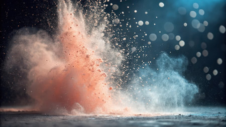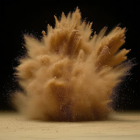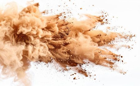 White powder and brown dirt particles explode and scatter upwards in a dynamic burst