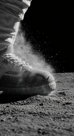 A monochrome low-angle view highlights an astronaut's heavy boot firmly planting on an extraterrestrial landscape, generating a dramatic plume of fine particulate matter.