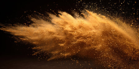 A golden powder erupts from a dark surface against a black backdrop, forming a dynamic cloud