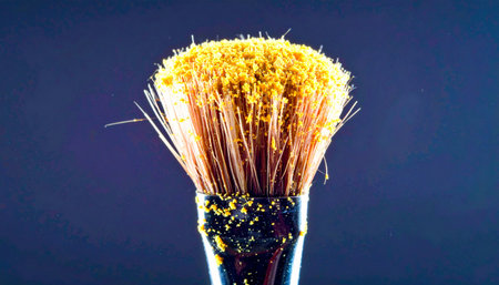 A fine cosmetic brush releasing a vibrant dust cloud against a dark background, perfect for illustrating creativity and beauty in makeup artistry.