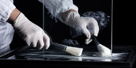 Forensic investigator in uniform dusting a glass evidence plate with powder and brush, revealing a clear fingerprint while wearing protective gloves at a crime scene lab investigation