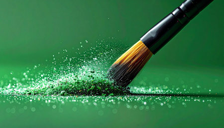 A cosmetic brush sweeps through a pile of vibrant green glitter, creating a dynamic explosion of sparkling particles.