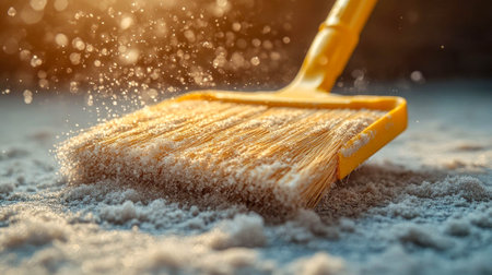 A traditional broom is captured in action as it sweeps dust and debris into the air, creating a dynamic and visually striking image perfect for cleaning themes.