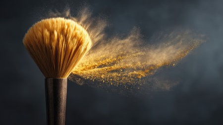This striking image showcases a cosmetic brush releasing a cloud of powder on a dark background, highlighting beauty and elegance with a touch of artistry and movement.