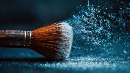 A stunning close-up of a makeup brush releasing fine powder particles, creating a beautiful visual effect against a dark, moody background.