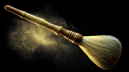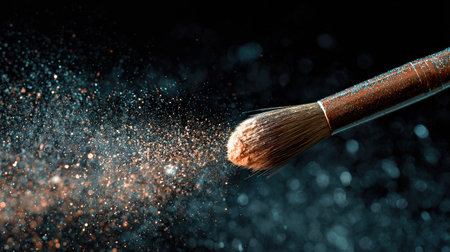 A close-up view of a makeup brush releasing shimmering particles against a dark background, capturing the essence of beauty and glamour in a creative artistic manner.