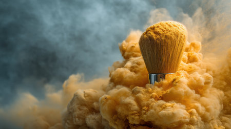A stunning close-up of a makeup brush with fine powder swirling around it, showcasing the beauty and artistry involved in makeup application.