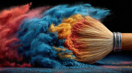 A brush releases a cloud of vivid blue, red, and yellow powders, mixing together in a dynamic explosion of color against a dark background, showcasing an artistic moment.