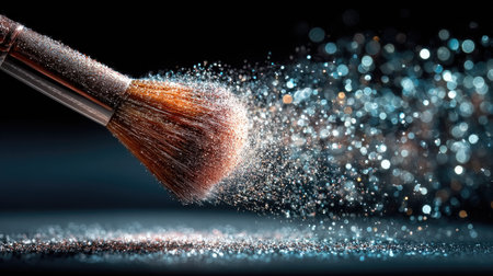 A stunning makeup brush releasing sparkling dust on a dark background, showcasing artistry in cosmetics and capturing the essence of beauty and glamour.