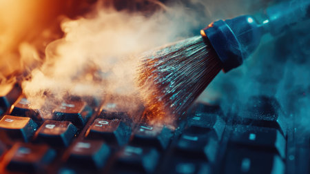 A captivating close-up image showcasing a keyboard being cleaned with a brush, enveloped in swirling smoke and dust particles. The dynamic lighting creates an atmospheric effect, emphasizing the importance of maintenance in technology.