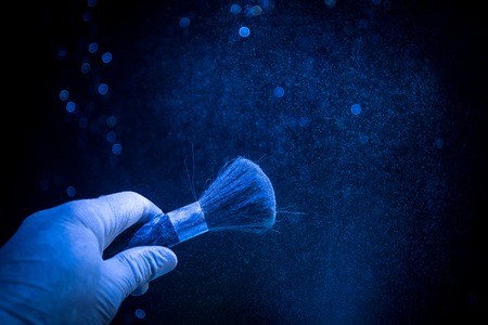 wonderful view on brush in male hand and talcum powder around in the air