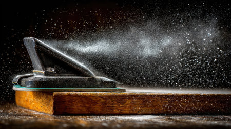 A stunning close-up of a traditional woodworking plane, releasing fine dust onto a wooden surface. This image captures the artistry of craftsmanship, showcasing tools used in woodworking.