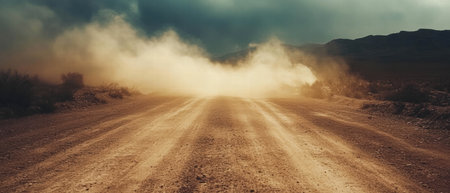 Dust storm engulfs desert road, creating a dramatic natural phenomenon