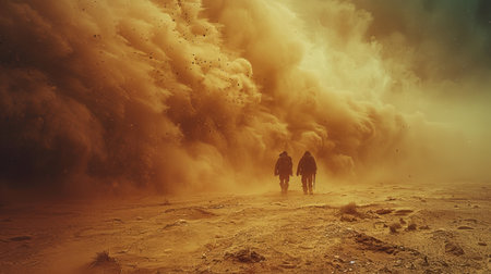 A massive dust cloud bills up from the desert ground swirling in the warm air. Sunlight casts a golden hue over the scene creating a dramatic effect.