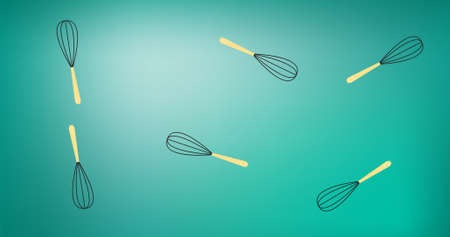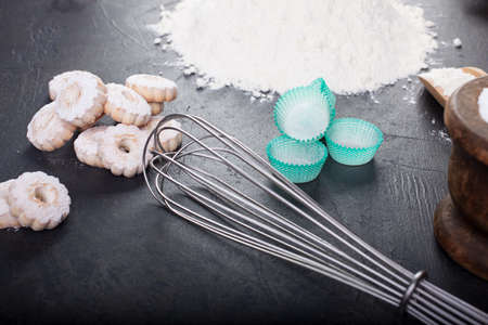 Pastry Baking Accessories Bakery Background with flour and whisk.