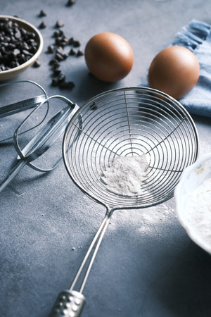 Ingredient for baking. Yolk of chicken egg with flour and a whisk for whipping the dough and dough shaker on a dark wooden background. flat lay. bakery concept