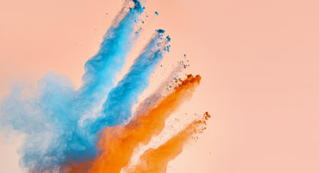 A stunning visual of a colorful smoke explosion featuring vibrant orange and blue powders dispersing dramatically across a white background.
