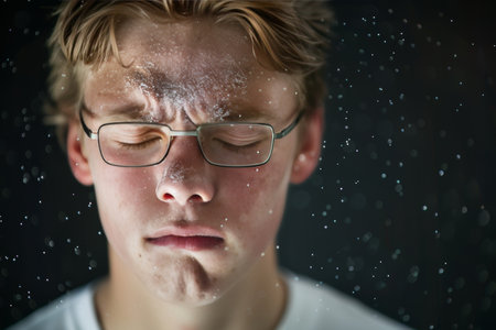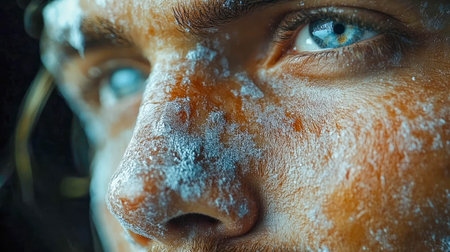 Close-up of a face with frosted texture, conveying resilience in harsh conditions or winter themes.